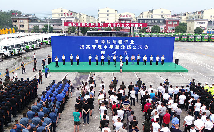 6月27日上午,晉源區(qū)運(yùn)輸行業(yè)“提高管理水平、整治揚(yáng)塵污染”現(xiàn)場會(huì)在康培園林工程機(jī)械部舉行。晉源區(qū)委書記楊繼承,區(qū)長李永強(qiáng)等主要領(lǐng)導(dǎo)及市、區(qū)、街鎮(zhèn)相關(guān)部門負(fù)責(zé)人和晉源區(qū)所有渣土運(yùn)輸、商砼、物流企業(yè)350余人參加了會(huì)議。
